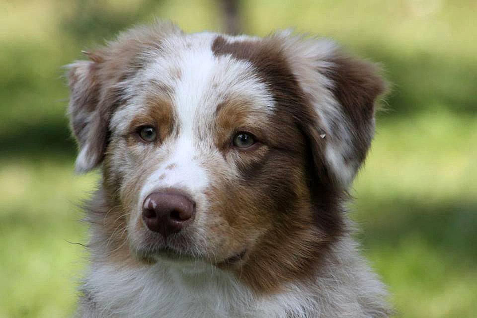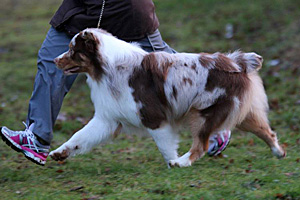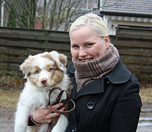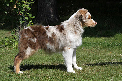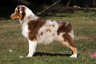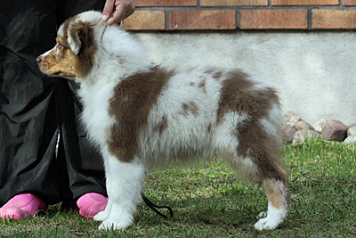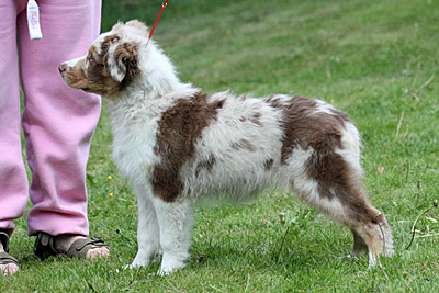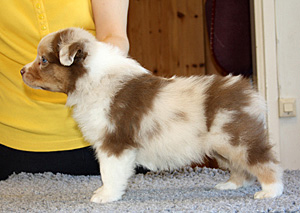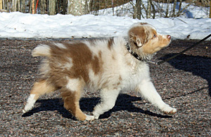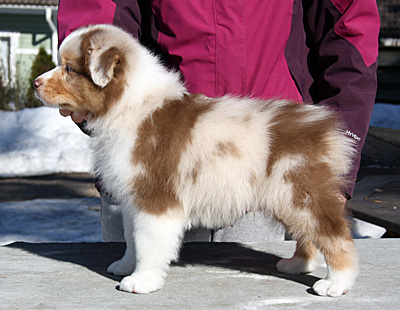 Born: 10.02.13 Sex: male HD: B-B OD: 0-0 Eyes: HSF-4 clear by parentage, HC, PRA, CEA, ICO clear as a puppy Tail: NBT 1/4 | Colour: red merle Eye colour: blueish so far Bite: scissors bite, missing 2xP4 underjaw Size: 36cm at 3 months, 41cm at 4 months, 44cm at 5 months, 47cm at 6 months, 50cm at 7 months, 52,5cm at 10 months Owner: Pia Laurila, Uusikaupunki |