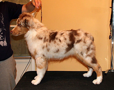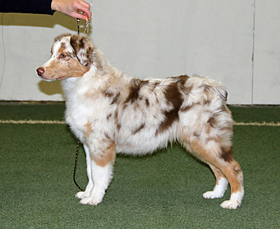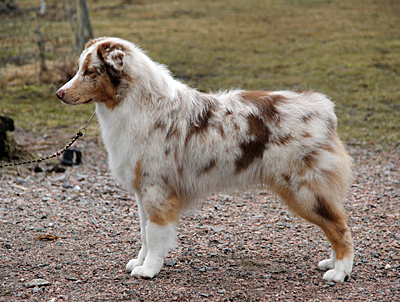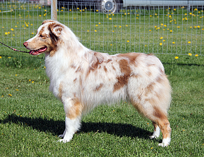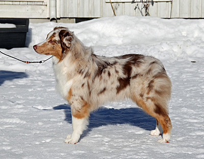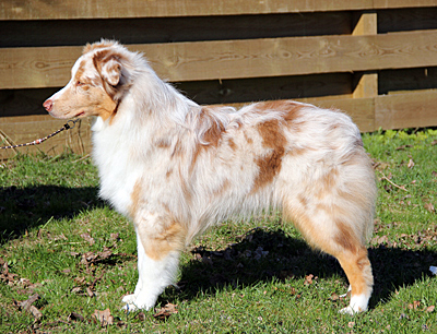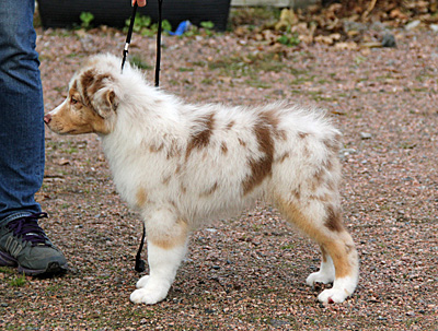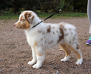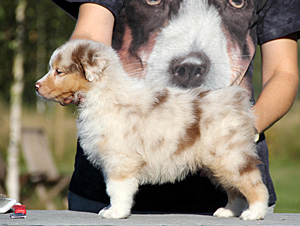 Born: 30.07.15 Sex: male HD: A-A OD: 0-0 Eyes: HSF-4 clear by parentage, HC, PRA, CEA, ICO clear as a puppy Tail: NBT | Colour: red merle Eye colour: amber Bite: scissors bite, missing 2xP4 Size: 36cm at 3 months, 42,5cm at 4 months, 46,5cm at 5 months, 50cm at 6 months, 51cm at 7 months, 51,5cm at 8 months, 52cm at 9 months, 53cm at 11 months, 53cm at 12 months Owner: Drover's |