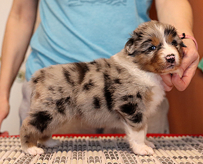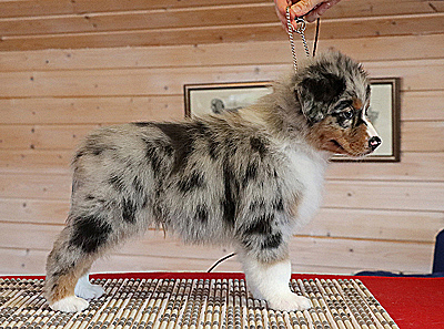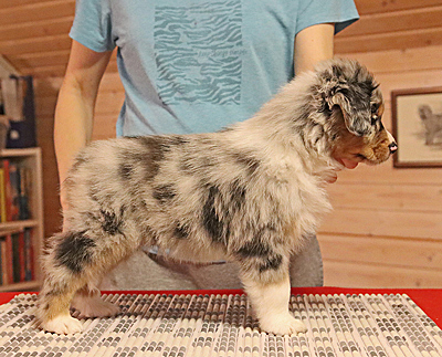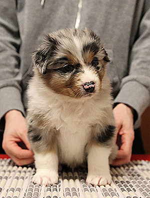Born: 13.12.21 Sex: male HD: C-D OD: 0-0 Eyes: cleared as a puppy Tail: long | Colour: blue merle Eye colour: brown Bite: scissor bite, full dentition Size: 53cm at 7 months Owner: Susanna & Heidi Martikainen, Espoo |