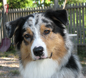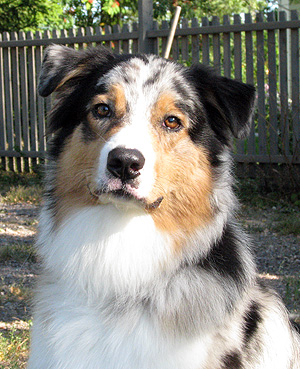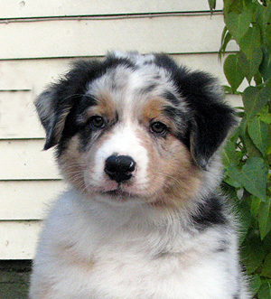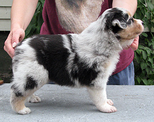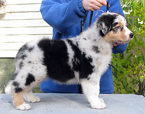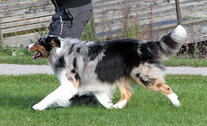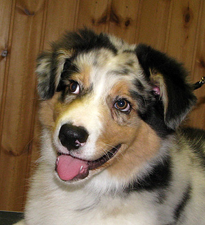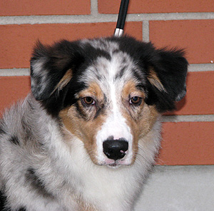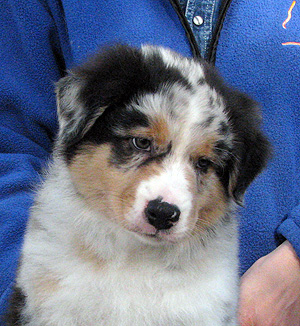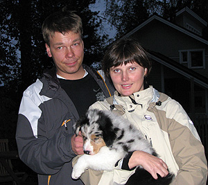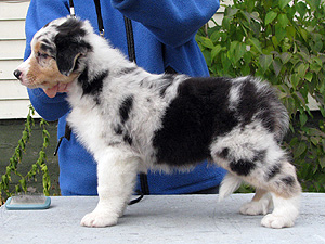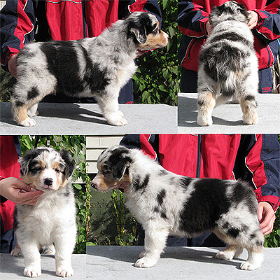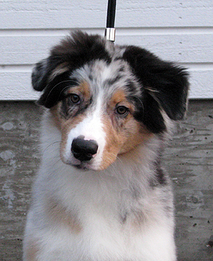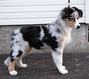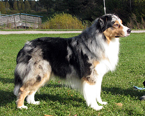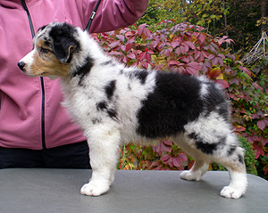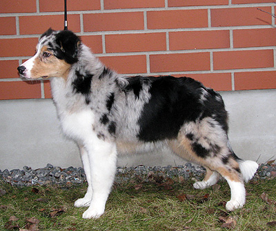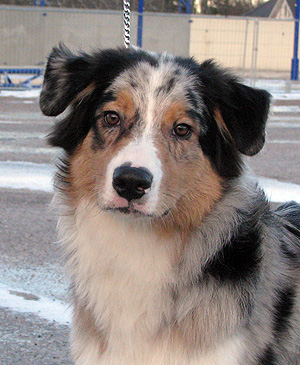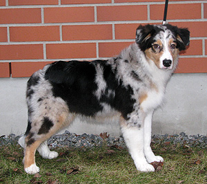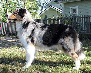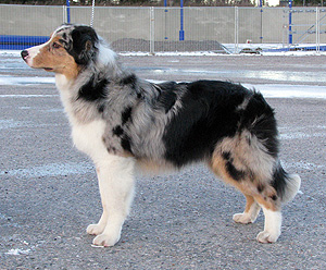 Born: 29.07.07 Sex: male HD: A-A OD: 0-0 Eyes: HC, PRA, CEA, ICO clear as puppy and as adult, clear of HSF4-type of HC by parentage Tail: long | Colour: blue merle Eye colour: brown Bite: complete scissors bite Size: 41,5cm at 3 months, 46,5cm at 4 months, 50,5cm at 5 months, 53,5cm at 6 months, 54,5cm at 7 months, 55,5cm at 8 months, 56cm at 9 months, 57cm at 10 months Owner: Satu Kärkkäinen, Nummela |