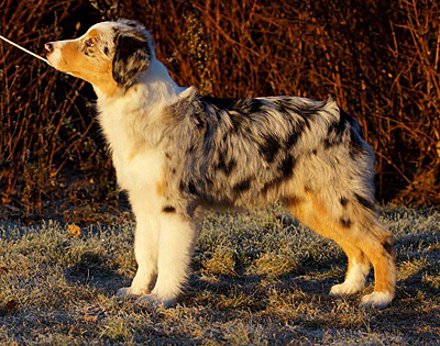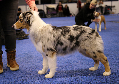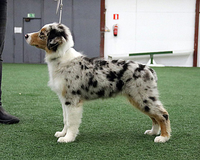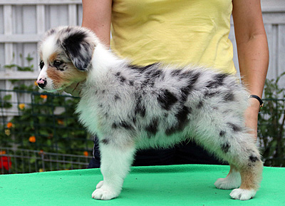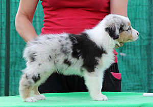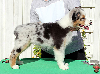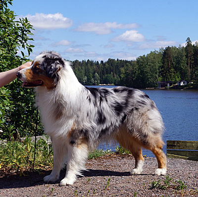 Born: 21.06.18 Sex: dog HD: B-A OD: 0-0 Eyes: HSF-4 clear by parentage, HC, PRA, CEA, ICO clear as a puppy Tail: NBT | Colour: blue merle Eye colour: brown Bite: scissors bite, full dentition Size: 37cm at 3 months, 41,5cm at 4 months, 46cm at 5 months Owner: Milla Vasama, Saukkola |