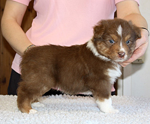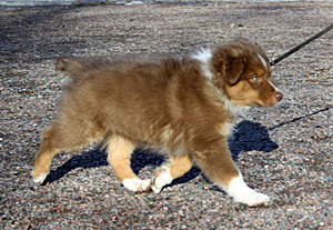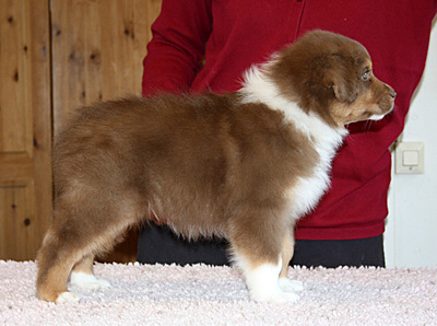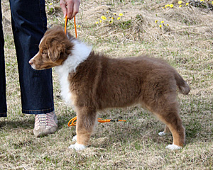 Born: 10.02.13 Sex: male HD: A-A OD: 0-0 Eyes: HSF-4 clear by parentage, HC, PRA, CEA, ICO clear as a puppy Tail: NBT 1/3 | Colour: red tricolour Eye colour: amber Bite: scissors bite, full dentition Size: 34cm at 12 weeks, 50cm at 7 months, 52cm at 9 months Owner: Tiina Huttula, Muhos |