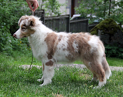 Born: 10.02.13 Sex: bitch HD: A-A OD: 0-0 Eyes: HSF-4 clear by parentage, HC, PRA, CEA, ICO clear as a puppy Tail: long | Colour: red merle Eye colour: amber Bite: scissors bite, full dentition Size: 40cm at 4 months, 48cm at 6 months, 49cm at 19 months Owner: Marja Lopperi, Vantaa |