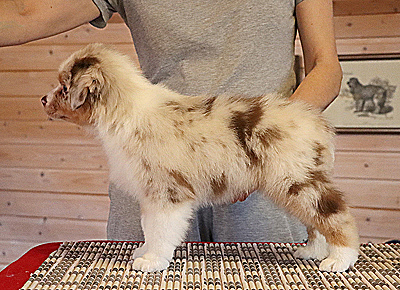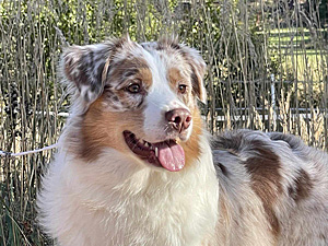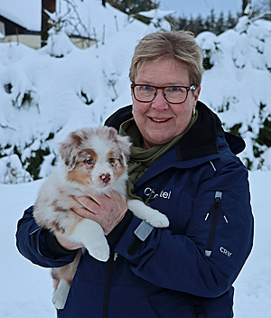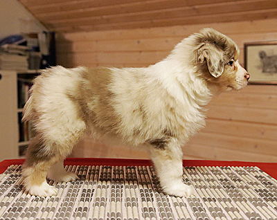 Born: 13.12.21 Sex: bitch HD: A-A OD: 0-0 Eyes: cleared as a puppy Tail: NBT | Colour: red merle Eye colour: brown Bite: scissor bite, full dentition Size: 48cm at 3 years Owner: Christel Sundman, Maarianhamina |