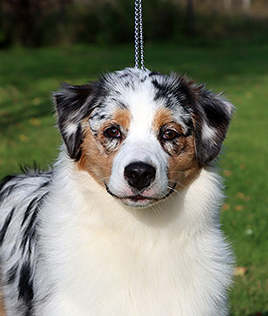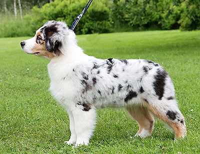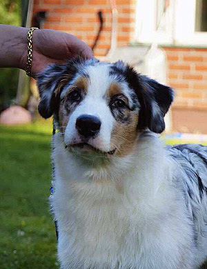Born: 25.02.25 Sex: bitch HD: OD: Eyes: cleared as a puppy Tail: long | Colour: blue merle Eye colour: brown Bite: scissor bite, full dentition Size: 38cm at 4 months, 44cm at 6 months, 45,5cm at 8 months Owner: Oona Koponen & Aapo Lahti, Lohja |