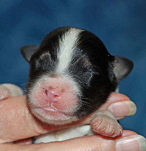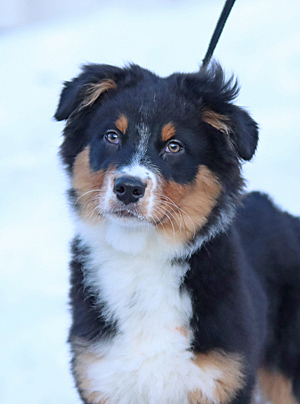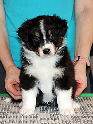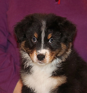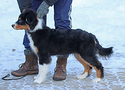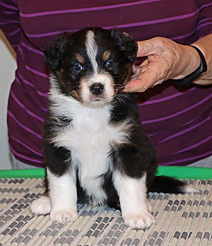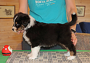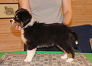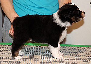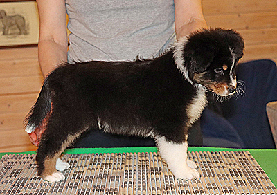 Born: 04.10.22 Sex: hane HD: OD: Eyes: �gon u.a. som valp Tail: l�ng | Colour: black tricolour Eye colour: bruna Bite: valpbett Size: 42cm vid 4m Owner: Katja Kallio, Esbo |