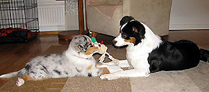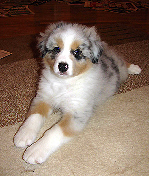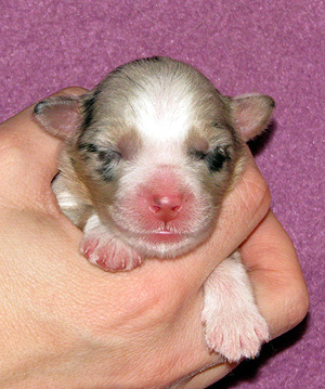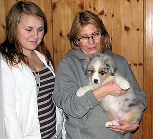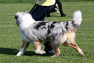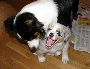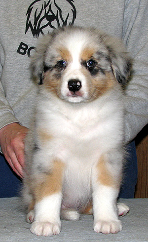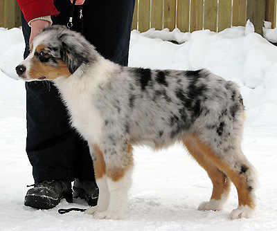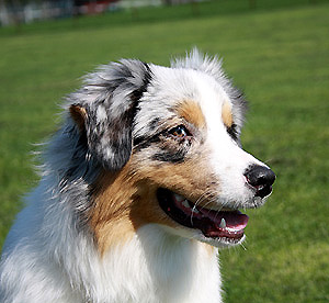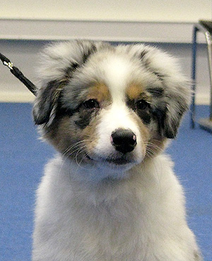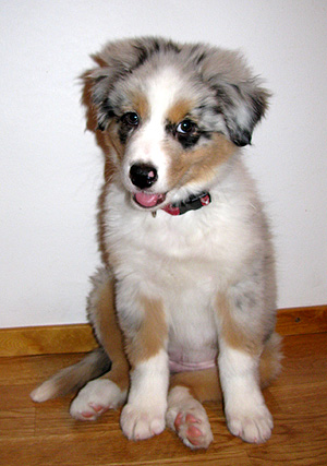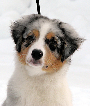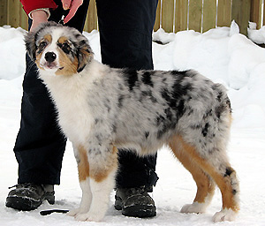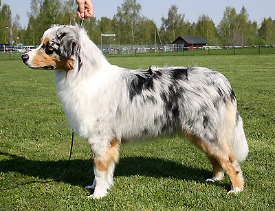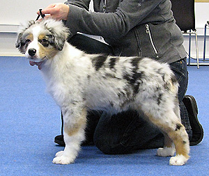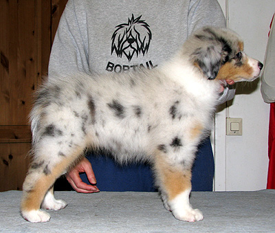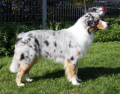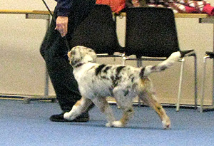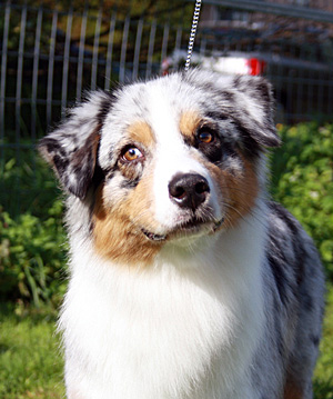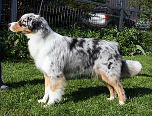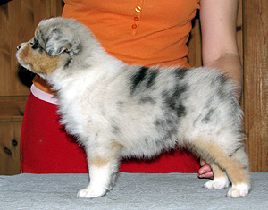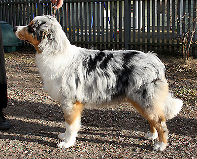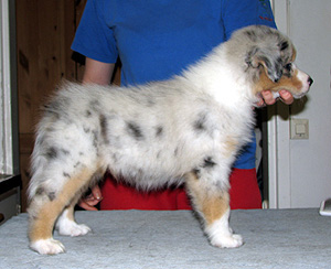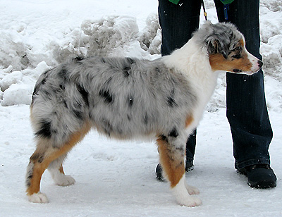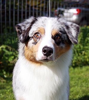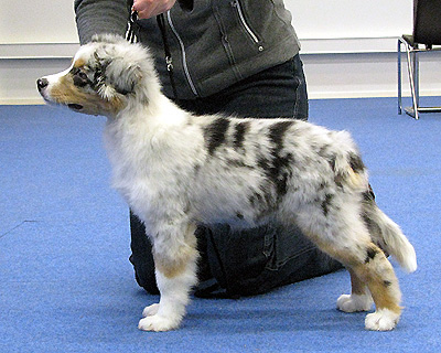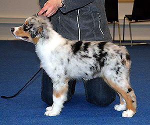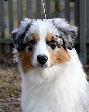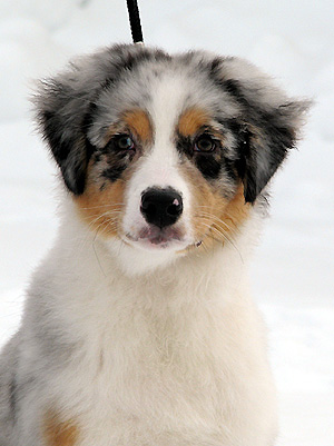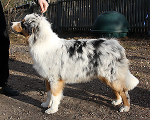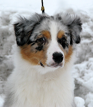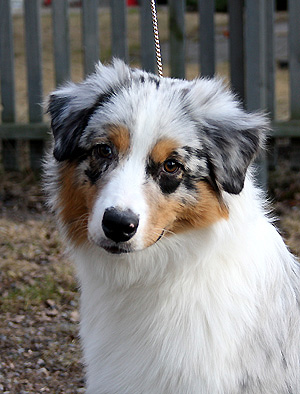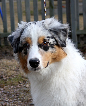 Born: 14.10.09 Sex: tik HD: A-A OD: 0-0 Eyes: fri av HSF4 typ katarakt, ögon u.a. som valp Tail: lång | Colour: blue merle Eye colour: höger öga merle, vänster öga brun Bite: saxbett, alla tänder Size: 37cm vid 3 mån, 44cm vid 4 mån, 47cm vid 5 mån, 49cm vid 6 mån, 50,5cm vid 7 mån, 51,5cm vid 11 mån, 52cm vid 23 mån Owner: Tiina Rytsölä, Kyrkslätt |
