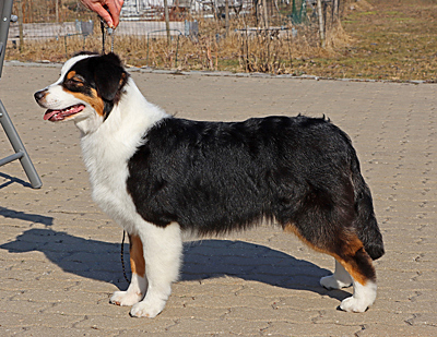 Born: 04.10.22 Sex: tik HD: OD: Eyes: �gon u.a. som valp Tail: l�ng | Colour: black tricolour Eye colour: bruna Bite: saxbett, alla tänder Size: 34cm vid 3m, 46cm vid 6m Owner: Satu Tuomi-Storm, Numminen |