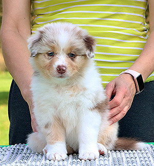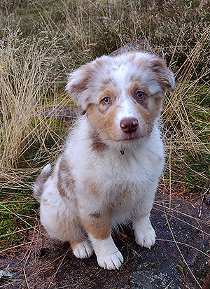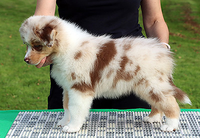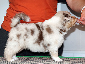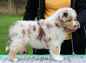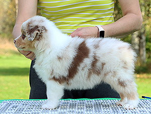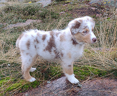 Born: 29.07.25 Sex: tik HD: OD: Eyes: ögon u.a. som valp Tail: lång | Colour: red merle Eye colour: bruna Bite: valpbett Size: Owner: Rebecka Aavanen, Gottby |