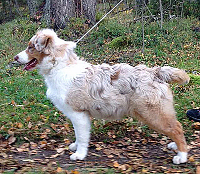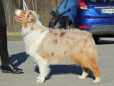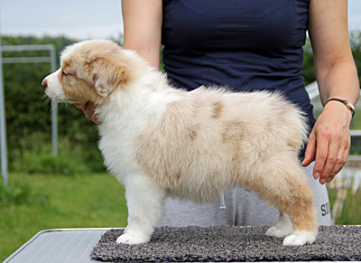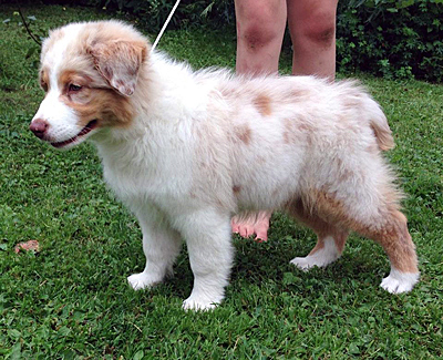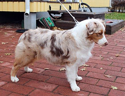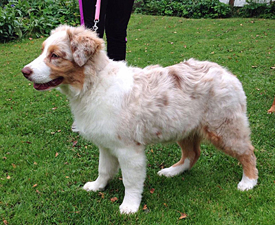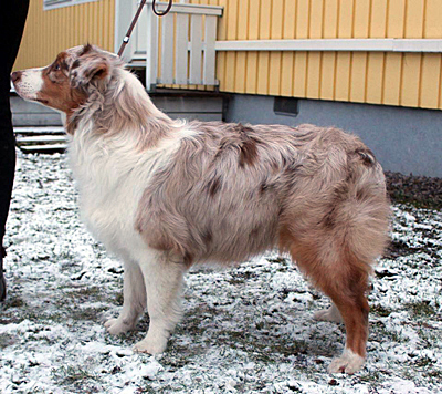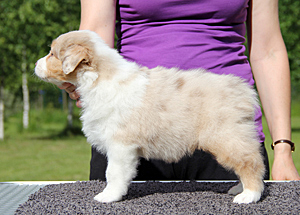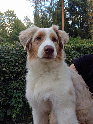 Born: 01.05.16 Sex: tik HD: B-B OD: 0-0 Eyes: HSF-4 fri, u.a. som valp Tail: NBT | Colour: red merle Eye colour: bärnstensbruna Bite: saxbett, alla tänder Size: 35cm vid 3mån, 42cm vid 4mån, 45cm vid 5 mån, 46cm vid 6 mån, 50cm vid 12 mån Owner: Pauliina Hermunen, Esbo |